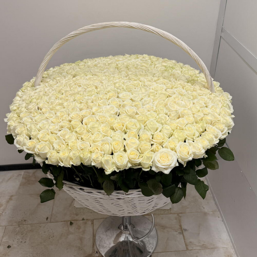 На фото букет из 501 белой розы в корзине «нежность». В составе: роза 501 шт, оазис флористический 7 шт, корзина (xl) 1 шт, . Все цветы свежие и ароматные, букет красиво оформлен и отлично подходит для подарка. Доступна доставка цветов или самовывоз.
