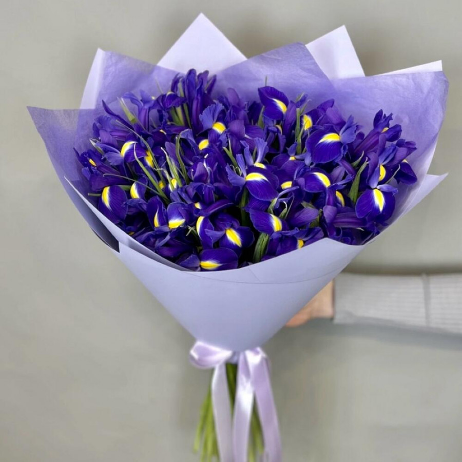 На фото букет из 51 синего ириса. В составе: ирис 51 шт, дизайнерская упаковка 2 шт, атласная лента 2 шт, . Все цветы свежие и ароматные, букет красиво оформлен и отлично подходит для подарка. Доступна доставка цветов или самовывоз.