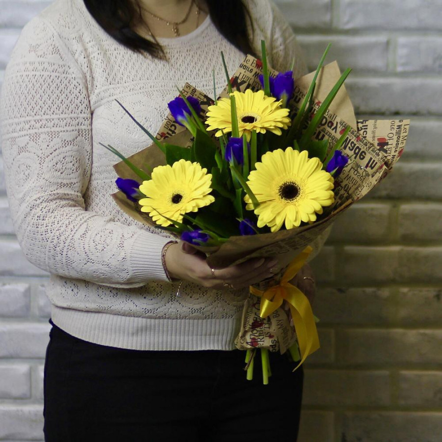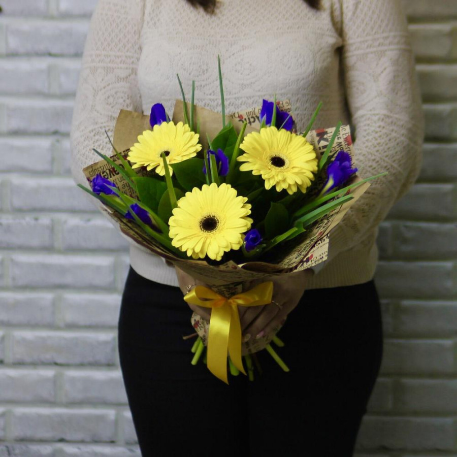 Букет из желтых гербер с синими ирисами в Кингисеппе