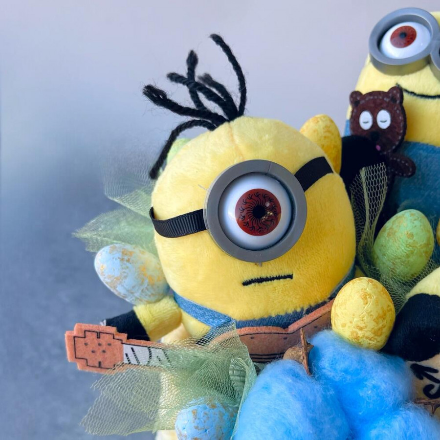 На фото букет из игрушек «миньоны». В составе: . Все цветы свежие и ароматные, букет красиво оформлен и отлично подходит для подарка. Доступна доставка цветов или самовывоз.