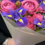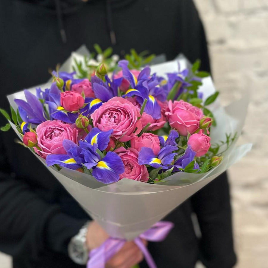 Букет из розовых пионовидных роз и синих ирисов в Кингисеппе