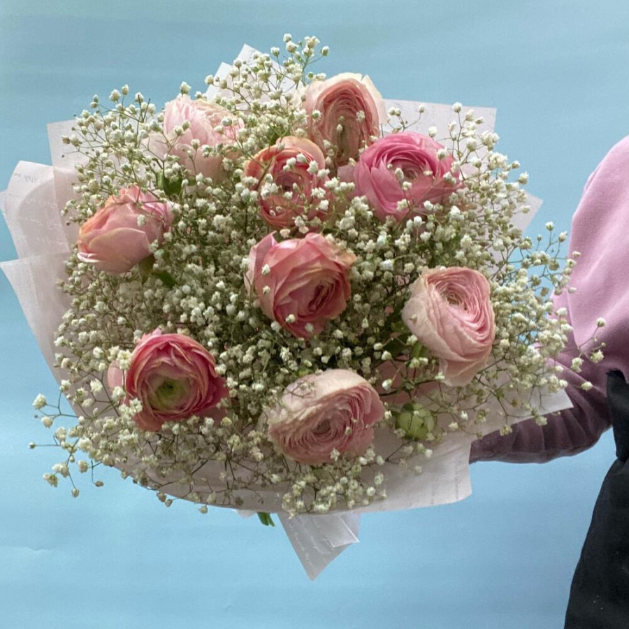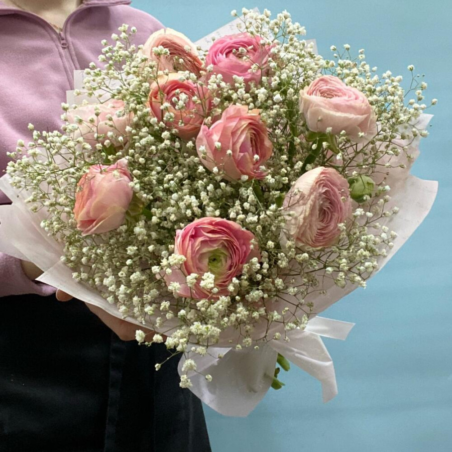 Букет из розовых ранункулюсов с белой гипсофилой в Кингисеппе